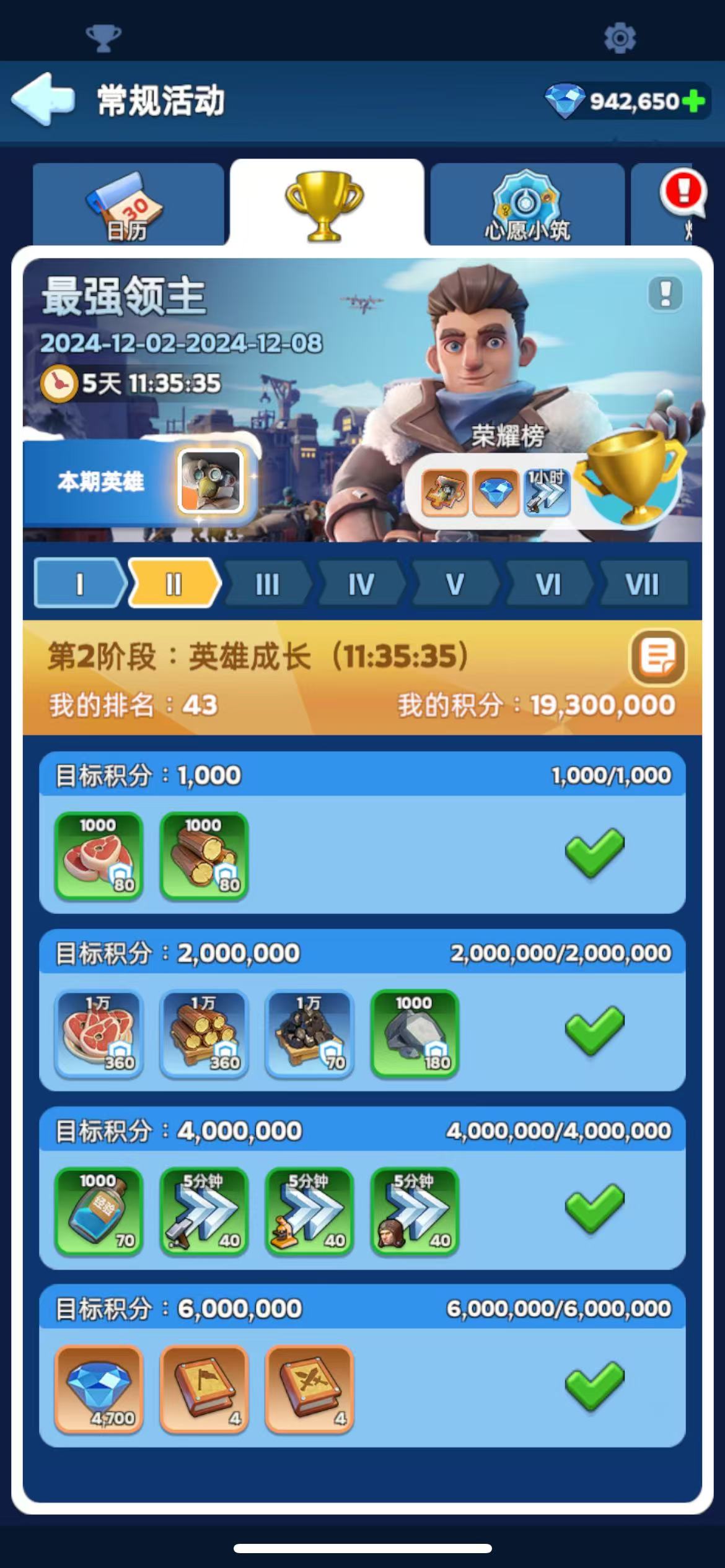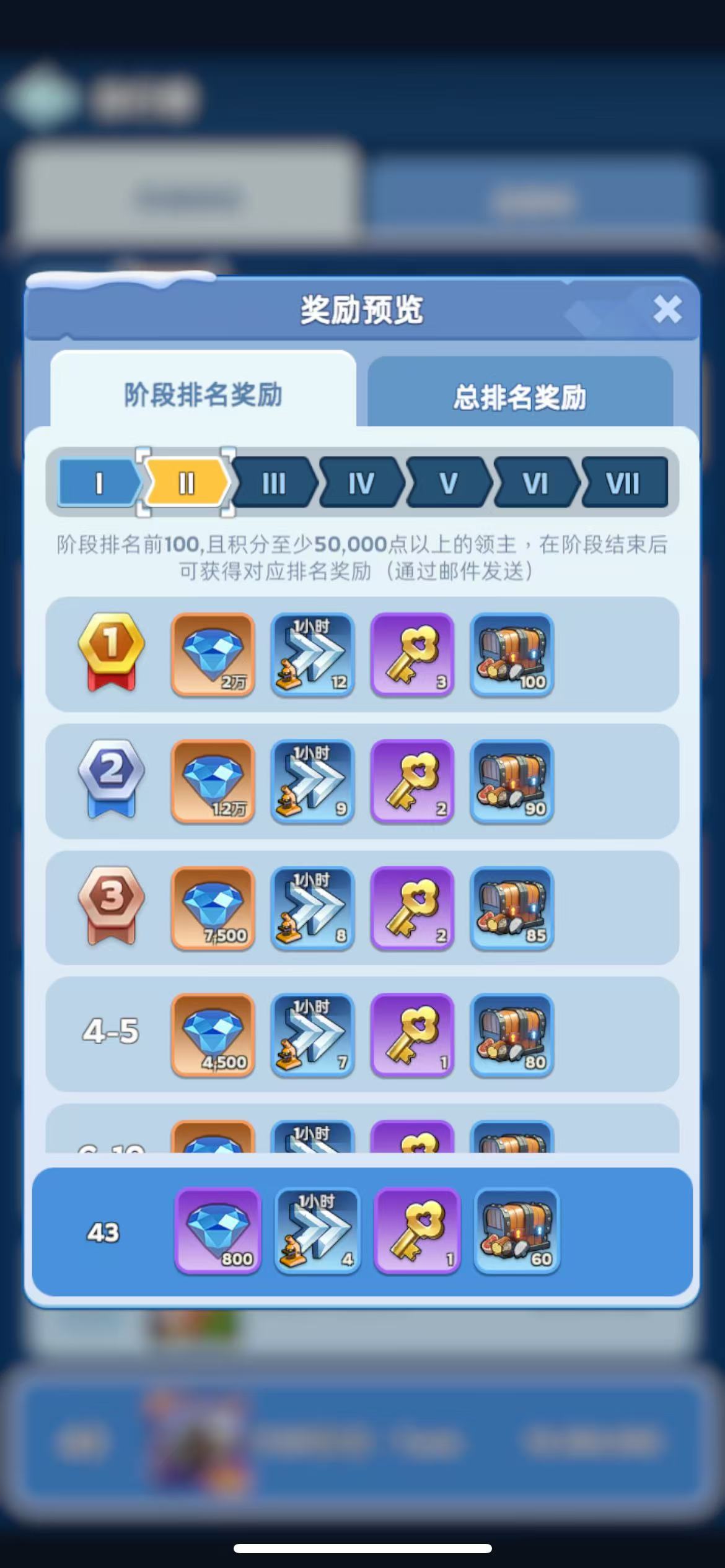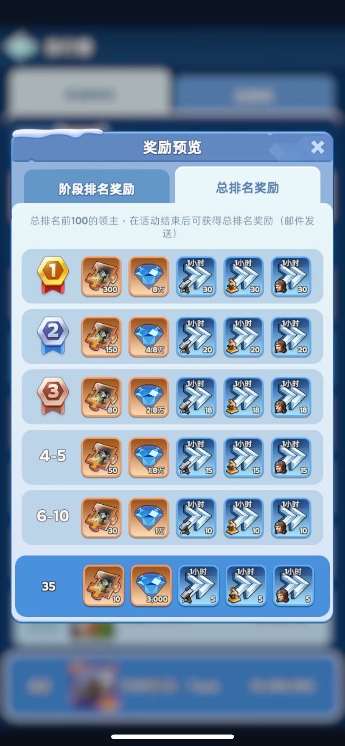 1.本次活动分为7个阶段:城镇建设、基础能力提升、宝石升级、士兵训练、实力冲刺、领主提升和英雄成长,每个阶段持续1天。 2.每个阶段中,各位领主可通过达成指定条件获取积分,达成目标积分条件即可领取对应奖励。 3.每个阶段结束时,将根据阶段积分排名情况发放阶段排名奖励。 4.在活动结束时,将根据本次活动总积分排名情况发放总排名奖励。