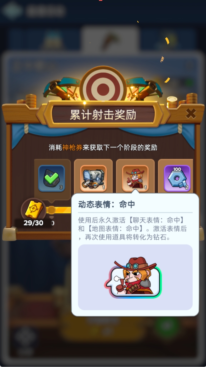 领主们在参与部分常规活动时,将有机会获得”神枪券”。使用”神枪券”参与射击,每次命中靶心都可随机获得丰厚道具奖励。集齐2枚“秘宝钥匙”即可开启宝箱,解锁额外惊喜!此外,消耗足够量的“神枪券”参与射击,还可解锁限定奖励—动态表情【命中】!