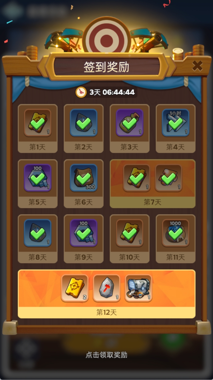 2玩法规则:关卡内有12个靶子,点击获得道具,共有3种:【秘宝钥匙】,【升级点数】,【加倍点数(+1)】