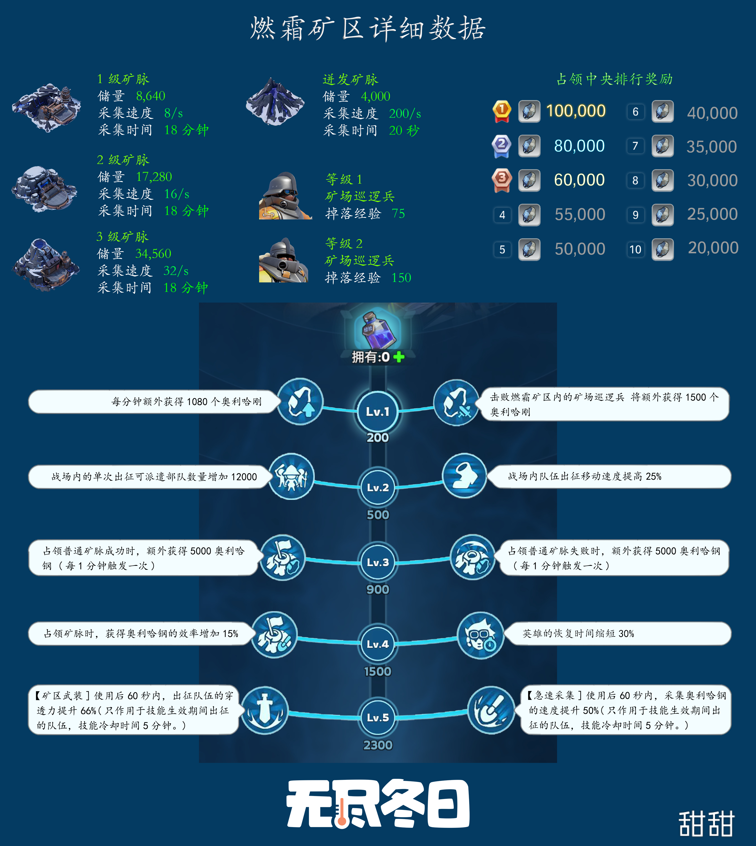 4.战斗阶段战场等待时间结束后,领主们可自由行动,占领各等级的矿脉,采集奥利哈钢。此外,矿区内会定期出现矿物储量极高的迸发矿脉供采集,合理分配出征队伍,方能取得最大收益。每场燃霜矿区的战斗持续30分钟在矿区战斗后期,【冶炼厂】将会开放。活动结束时,将根据占领该建筑的时间长短计算排名,并发放相应的奥利哈钢作为排名奖励。