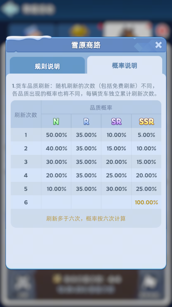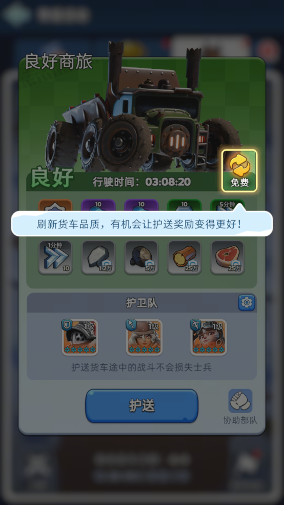 3.货车品质:货车有多种品质,品质越高,护送奖励越丰厚。在货车出发前可消耗【商旅券】道具,随机刷新货车品质。每辆货车都有1次免费随机刷新品质的机会。
