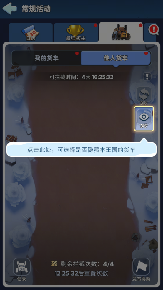 5.发车时间:通商开始后即可让货车发车,每个通商小阶段持续24小时,最后一个通商小阶段持续28小时,前24小时可以护送货车,最后4小时不再进行货车通商,只能拦截正在行驶中的货车,请注意时间避免错过。