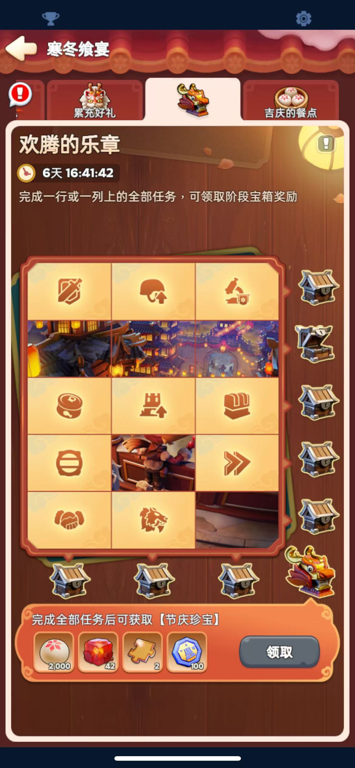 2.完成一行(横向)或一列(纵向)上的全部任务,可解锁阶段宝箱。