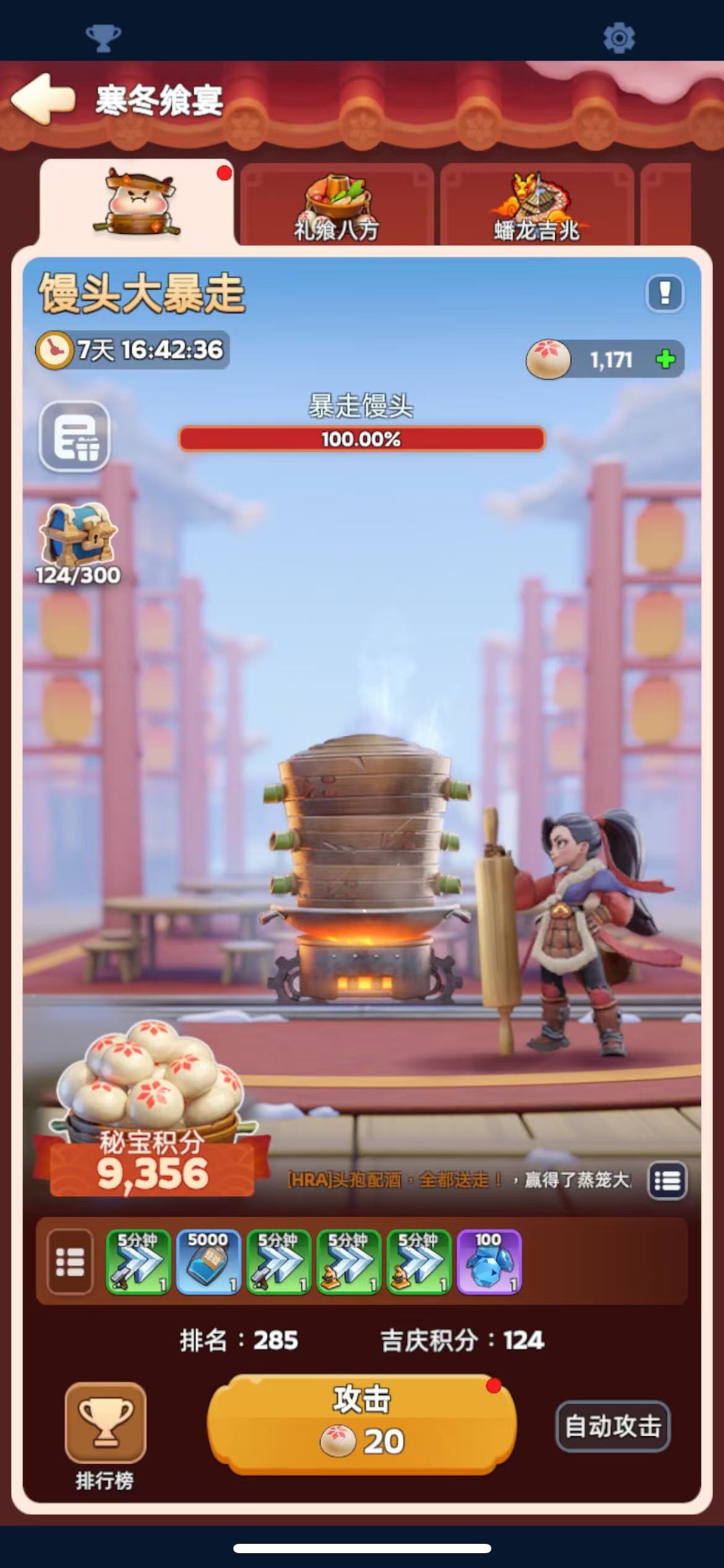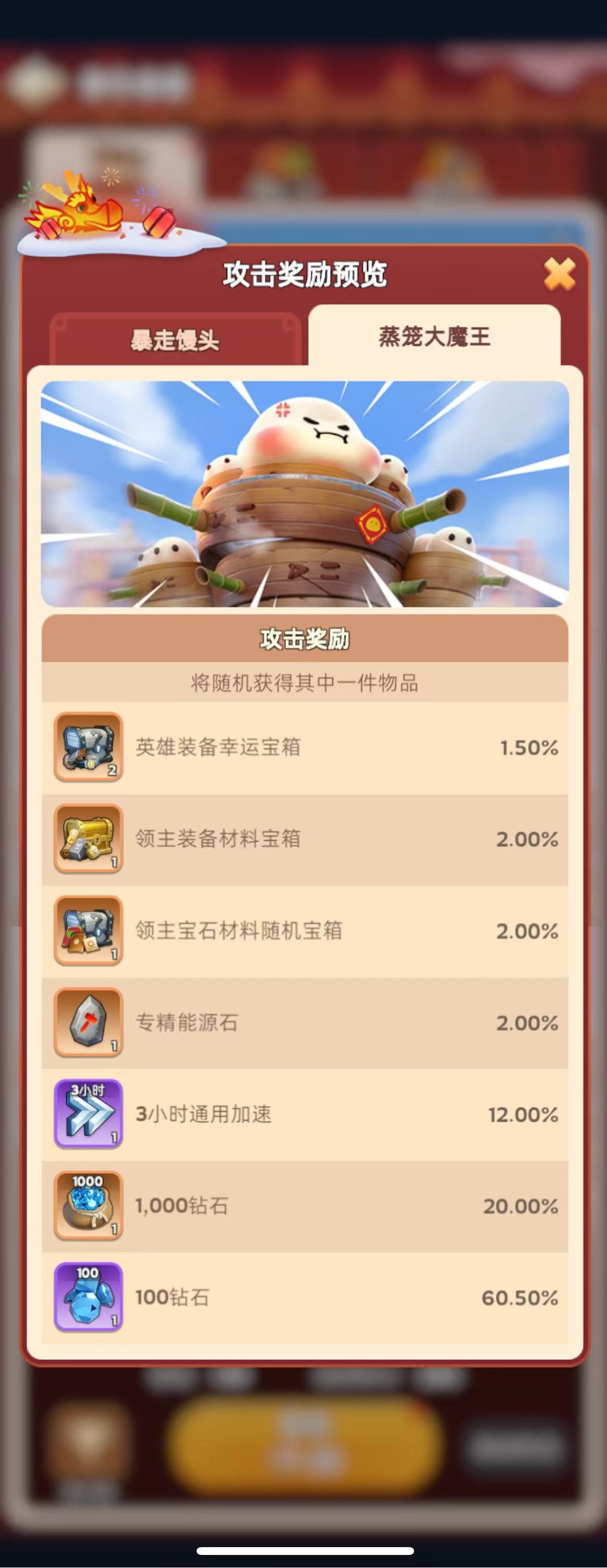 2.每次击败暴走馒头,将提升2点秘宝积分,并能从【精致餐点宝箱】中获得随机奖励,还有可能招来“蒸笼大魔王”。