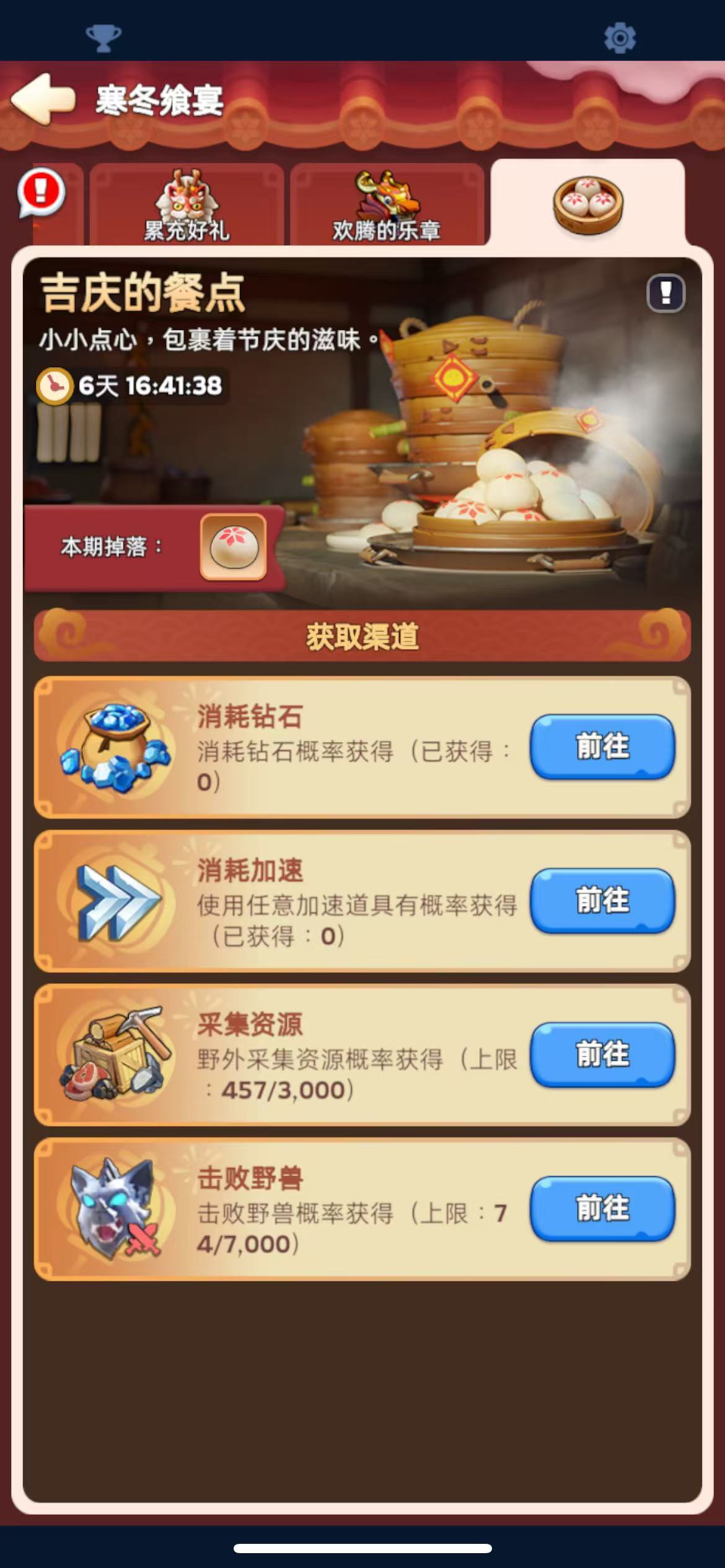 - 精致的点心将庆典的滋味带到冰原的每个角落。近期通过击败野兽、资源采集、消耗钻石或使用加速道具有机会发现吉庆馒头。