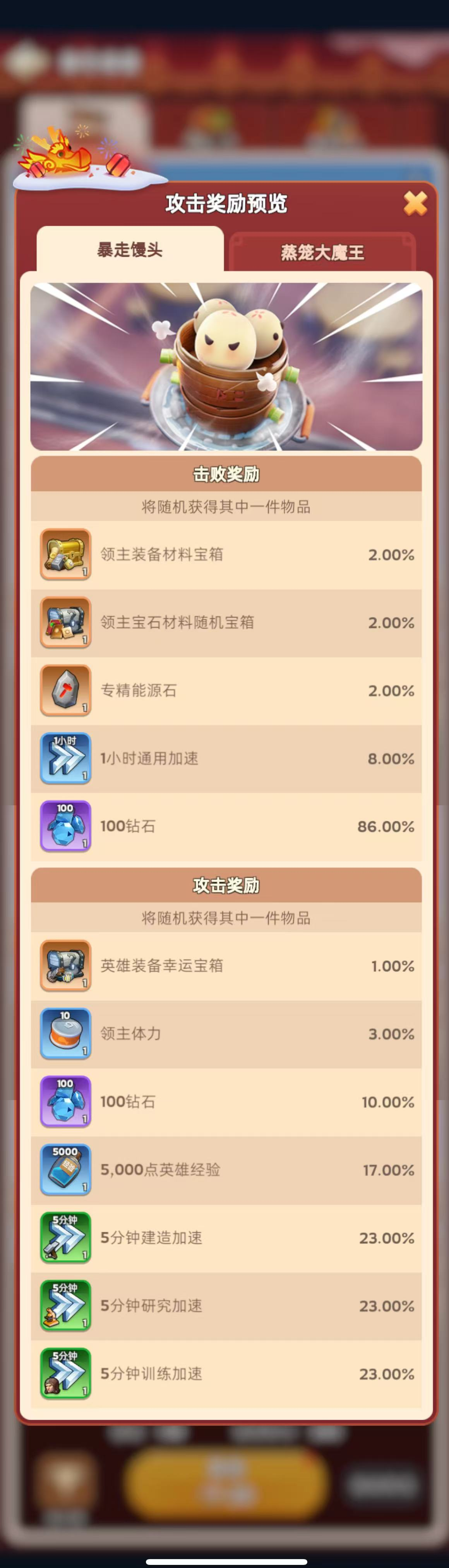 - 1.活动期间,领主可参加【馒头大暴走】,攻击暴走馒头,获得吉庆积分来提升等级并解锁奖励。