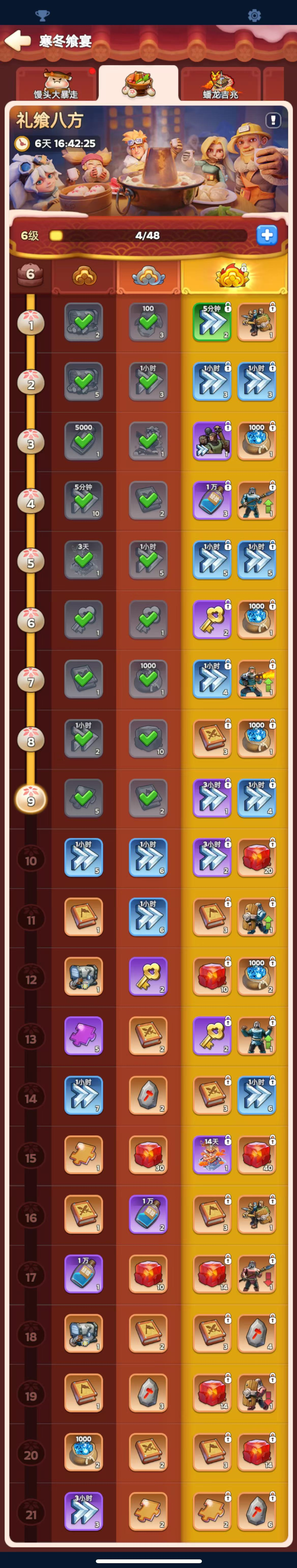 - 1.本次活动分为7个阶段:实力冲刺、击败野兽、英雄成长、训练士兵、英雄装备、资源采集和领主装备,每个阶段持续1天。