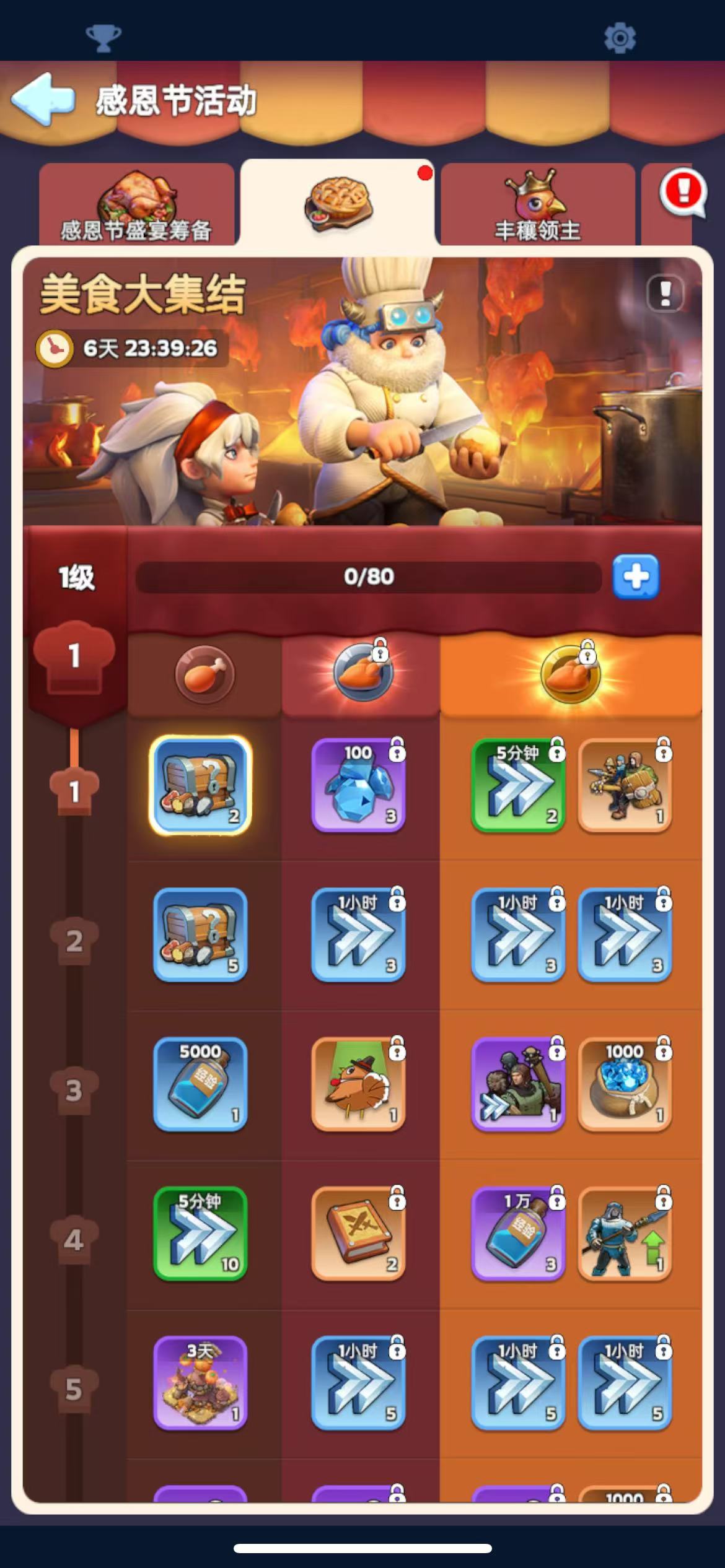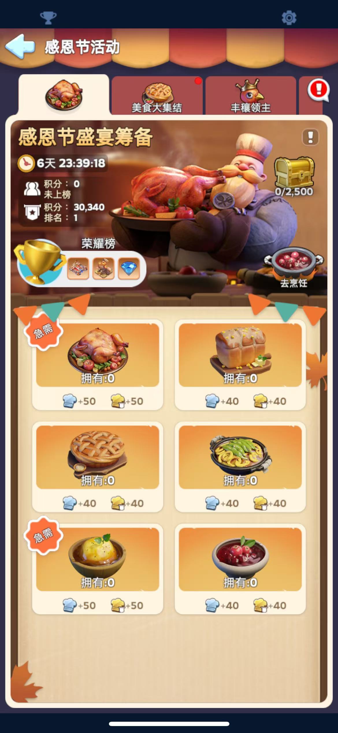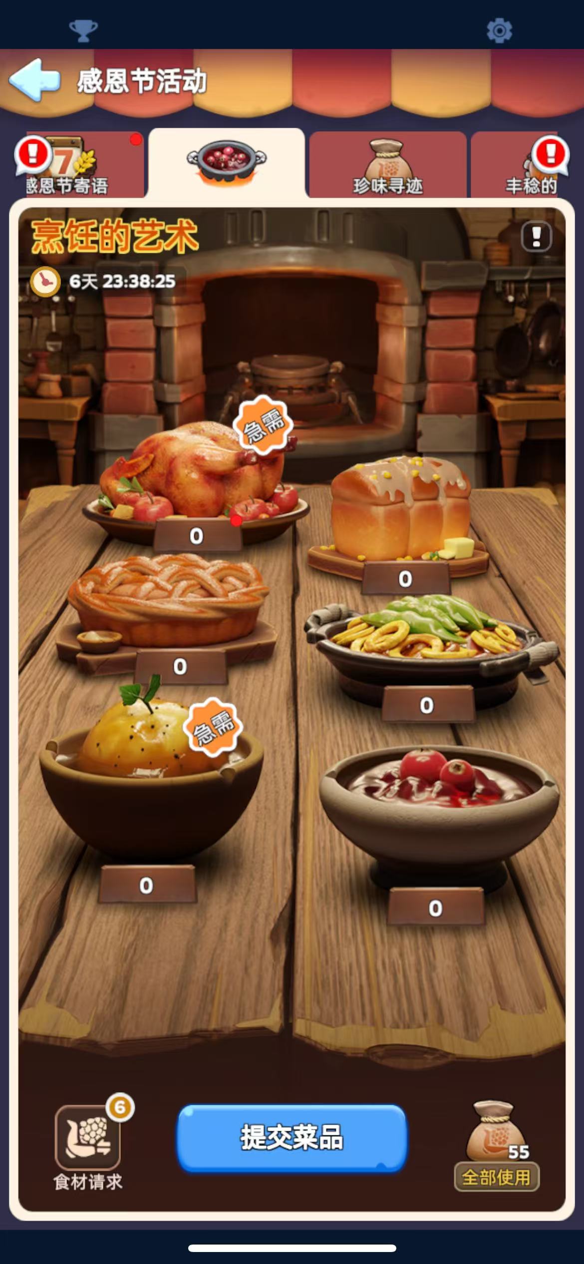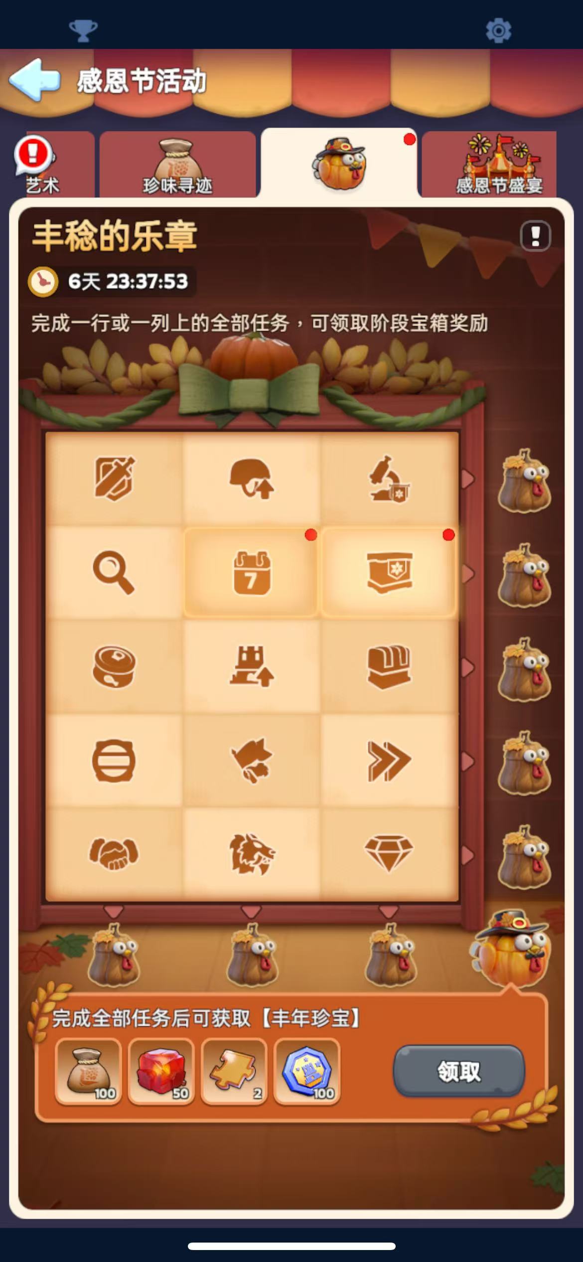 - 活动期间参加【感恩节盛宴筹备】,提交菜品,可获得本活动的积分,以提升等级、解锁奖励。