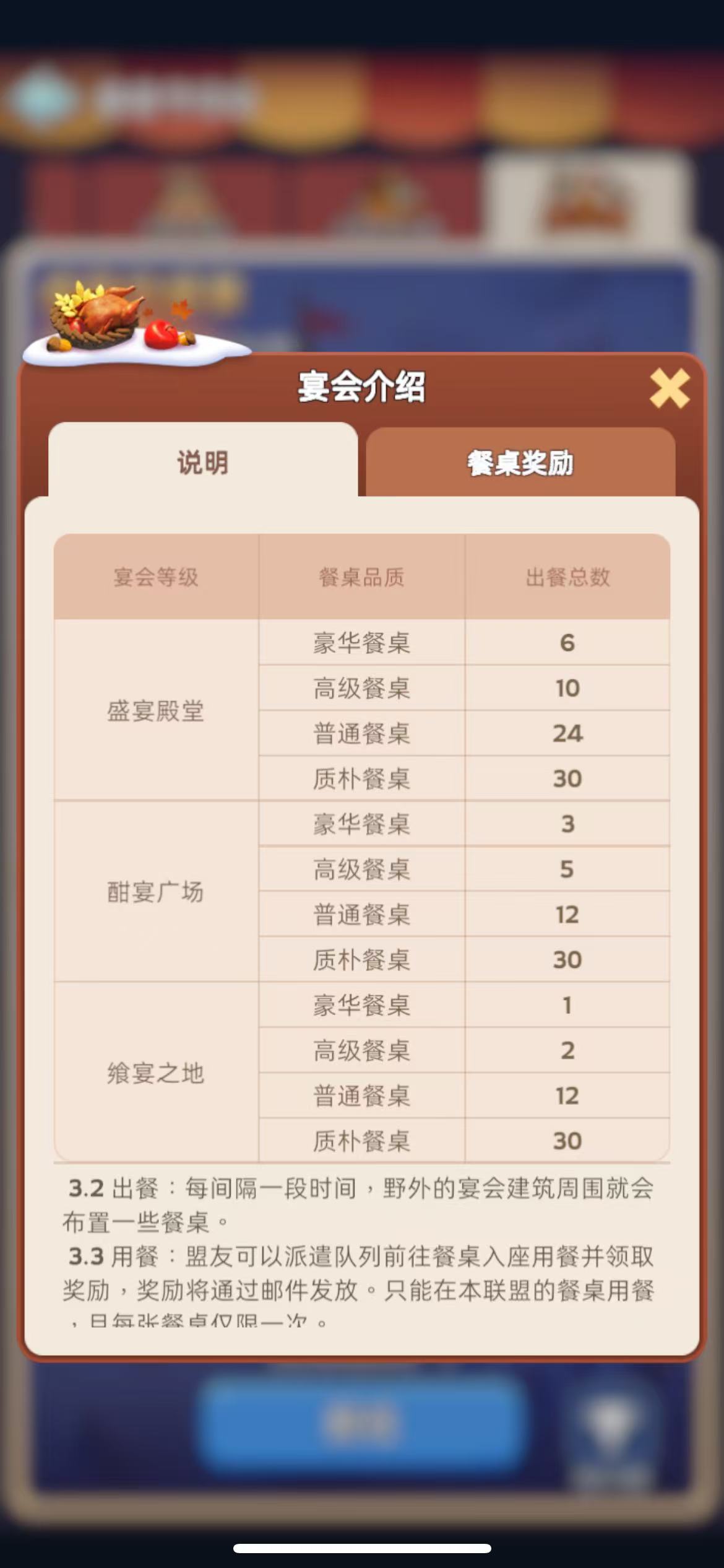 2.2如果宴会期间退出联盟,只要在宴会结束前重新加入【感恩节盛宴筹备】活动结算时所在的联盟,即可继续参与该联盟的宴会。 - 3.餐桌: