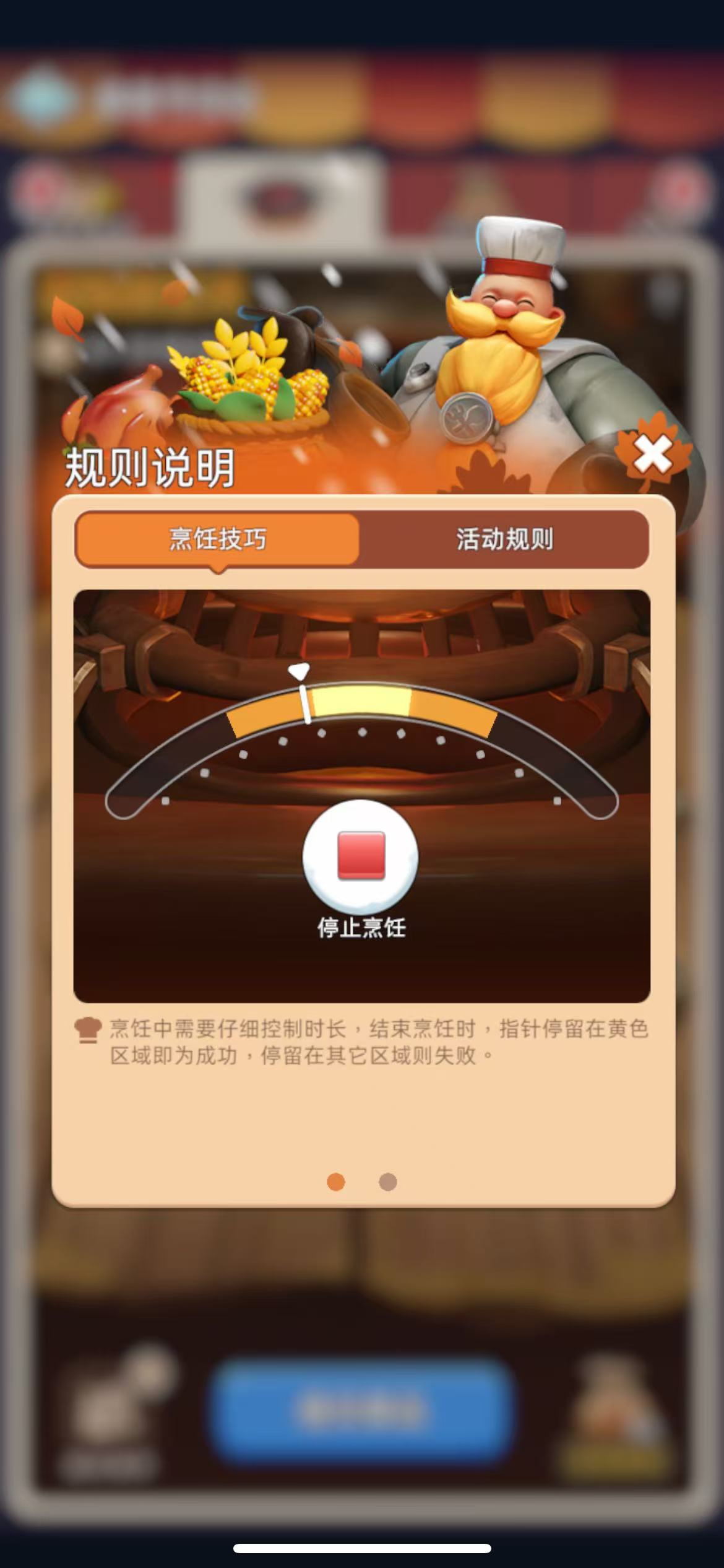 - 烹饪技巧:烹饪中需要仔细控制时长,结束烹饪时,指针停留在黄色区域即为成功,停留在其它区域则失败。